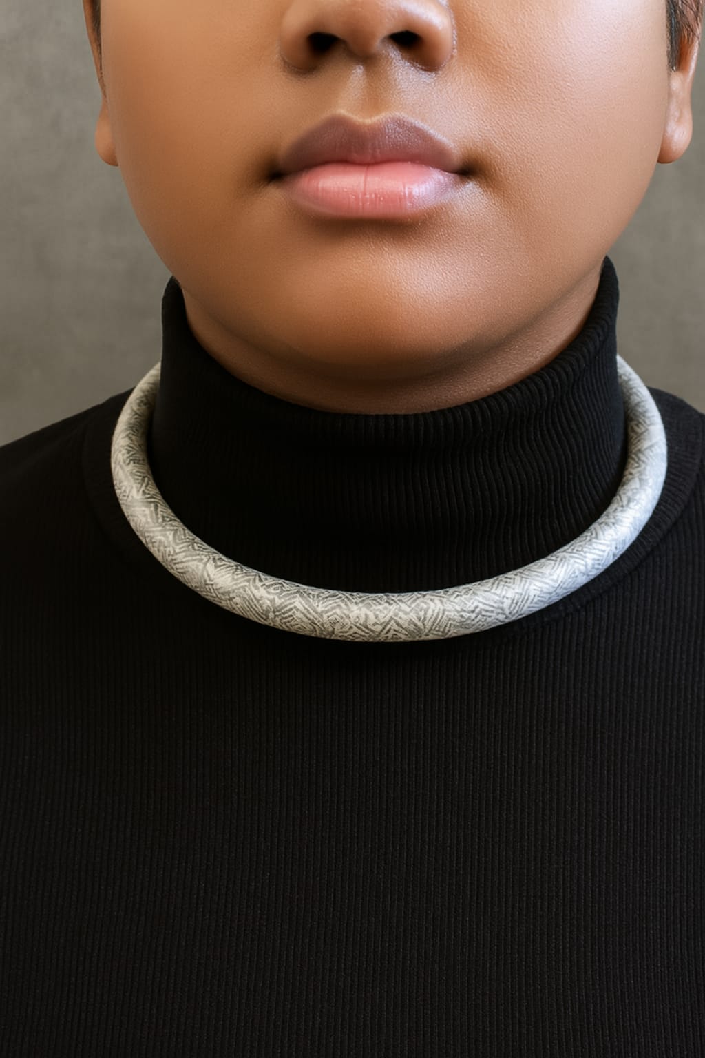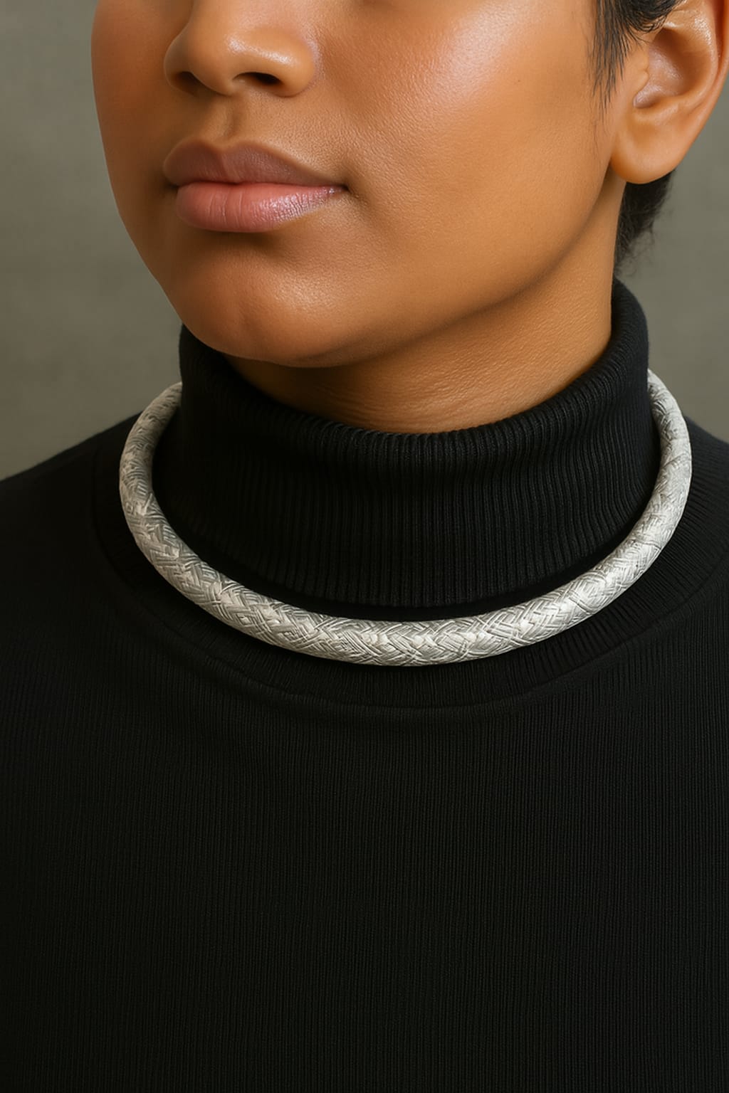 Crafted for those who appreciate bold sophistication, this braided silver necklace is a celebration of texture, light, and timeless design. Its thick, woven structure creates a sculptural silhouette that catches and reflects light with every movement, adding depth and drama to any ensemble. The metallic strands are intricately intertwined, forming a tactile surface that evokes both strength and refinement.