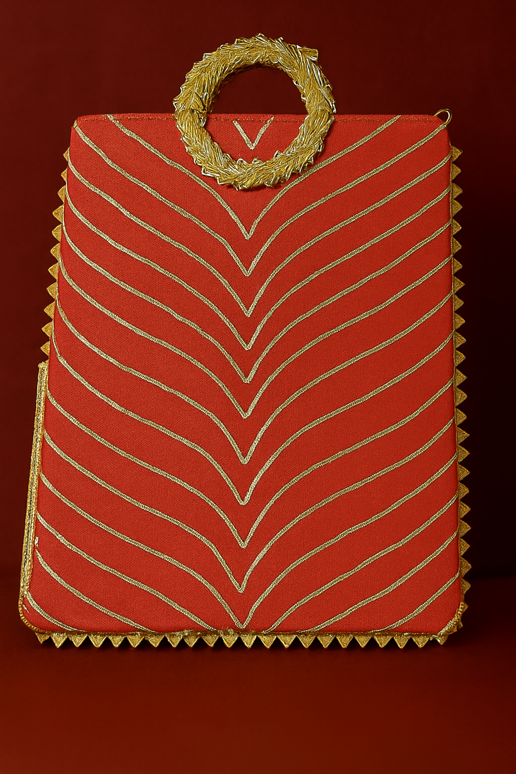 Carry celebration in every stitch. This handcrafted handbag blends traditional charm with festive sparkle. Featuring a bold square silhouette, shimmering wave-like silver embroidery, and a circular handle wrapped in glittering embellishments, it’s designed to stand out at every celebration. The zigzag trim adds a playful edge, while the compact size makes it perfect for gifting essentials or styling with ethnic wear.