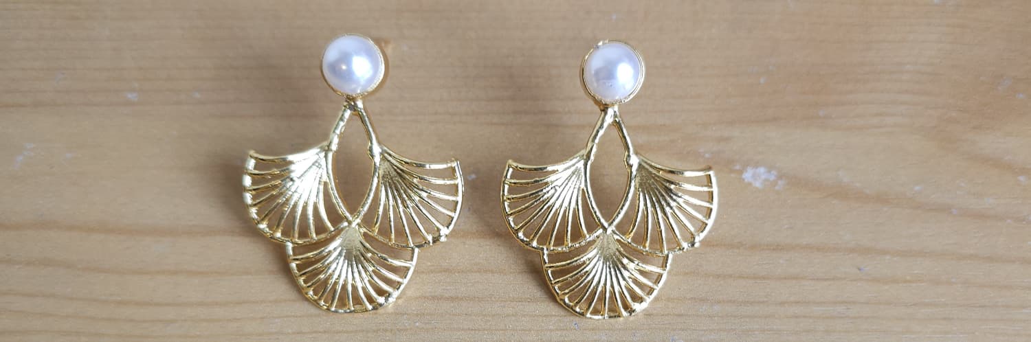 Botanical grace meets sculptural artistry in these radiant brass earrings. Each piece features a trio of pleated fan-shaped leaves cascading from a luminous pearl stud, creating a layered silhouette that catches the light with every turn. The golden finish enhances the organic curves, offering a refined yet playful statement.
