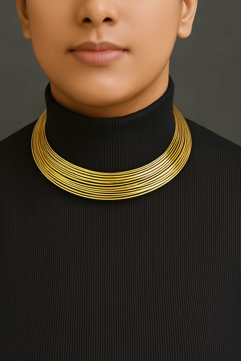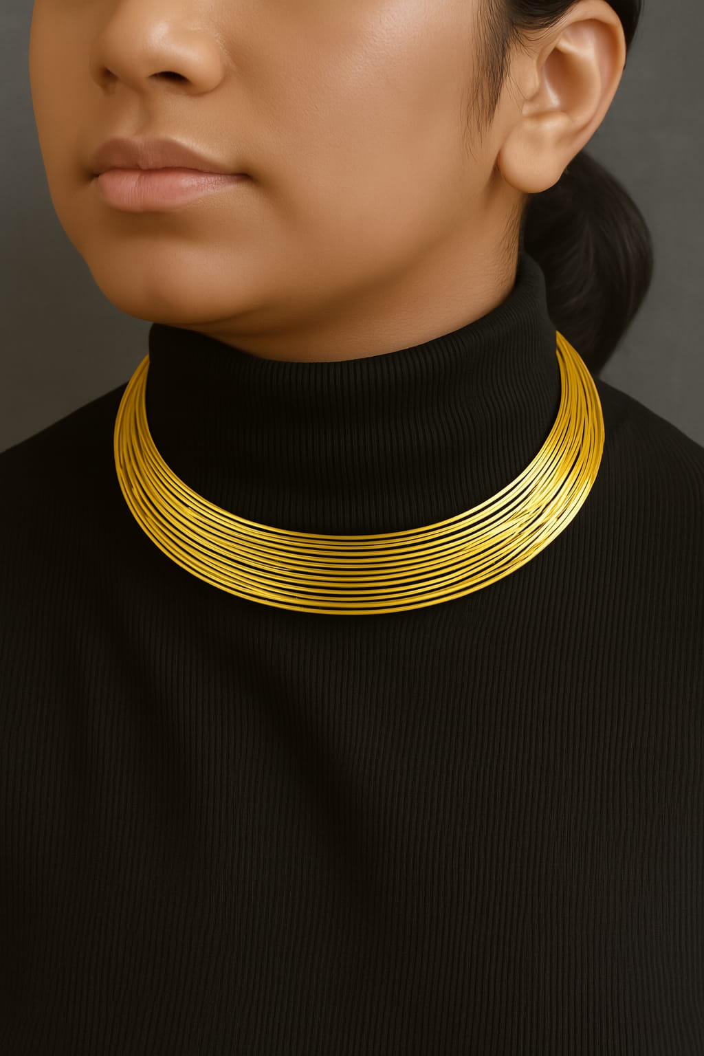 Radiate golden elegance with this stunning multi-strand wire hasli. Featuring layered gold-tone wires that create a bold, dimensional look, this modern collar necklace makes an instant statement. Lightweight yet impactful, it sits gracefully at the collarbone with a lustrous finish that catches every light.