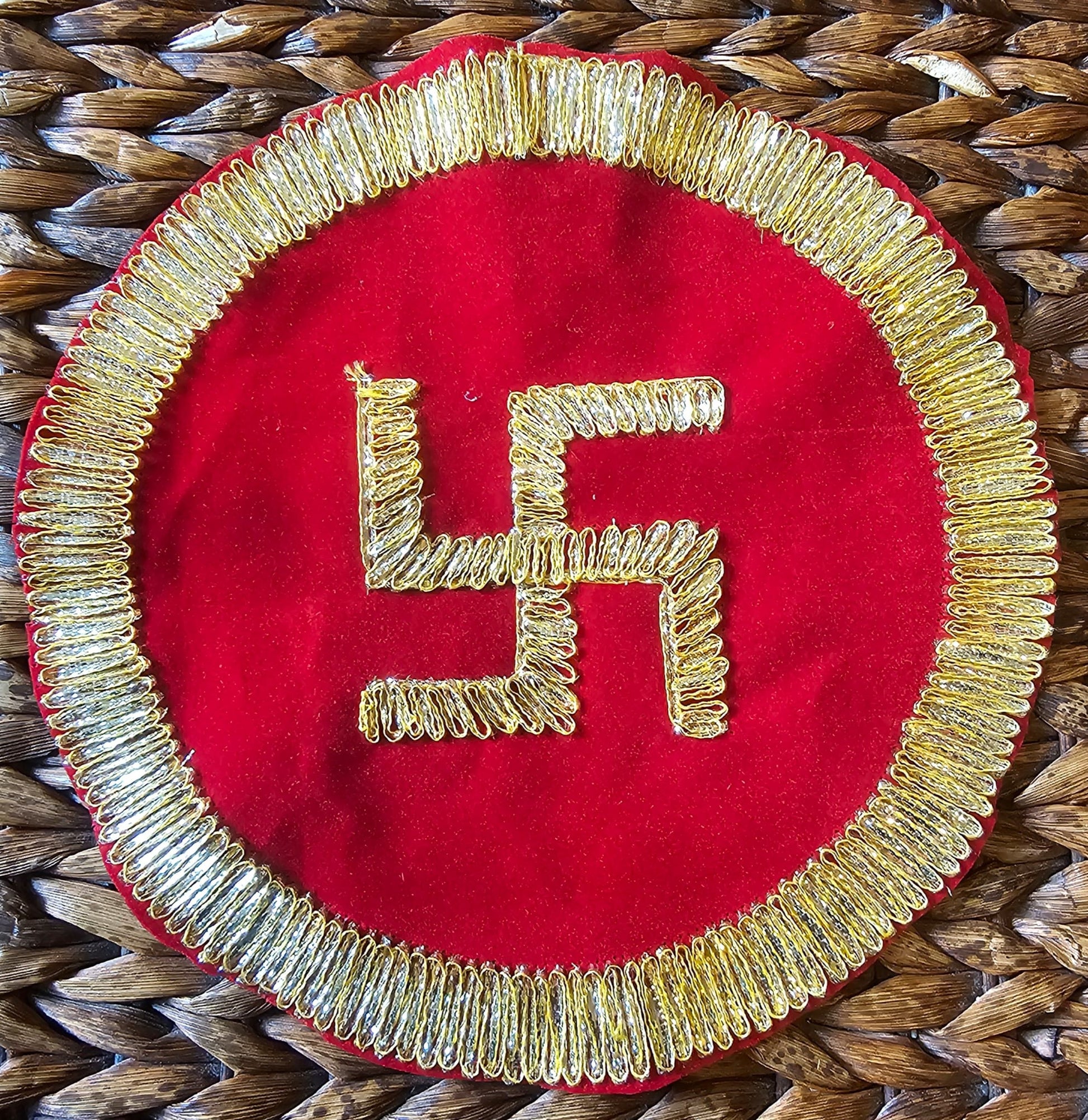 A round Swastik pooja aasan is a beautifully designed, circular mat or cloth used during religious rituals, particularly for sitting or placing sacred items during a pooja. At the center of the aasan is a prominently displayed Swastik symbol, representing good fortune, prosperity, and well-being in Hinduism.