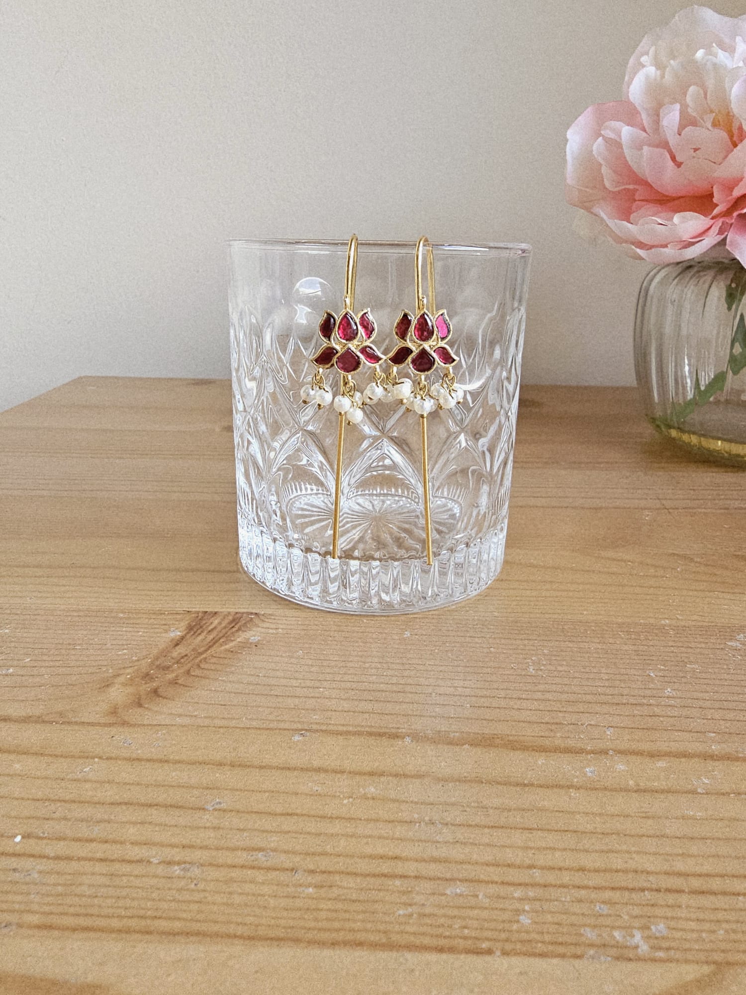 Golden Brass Floral Hook Earrings | Ruby & Pearl Solid Metal Drops | Simply Sajavat Manchester