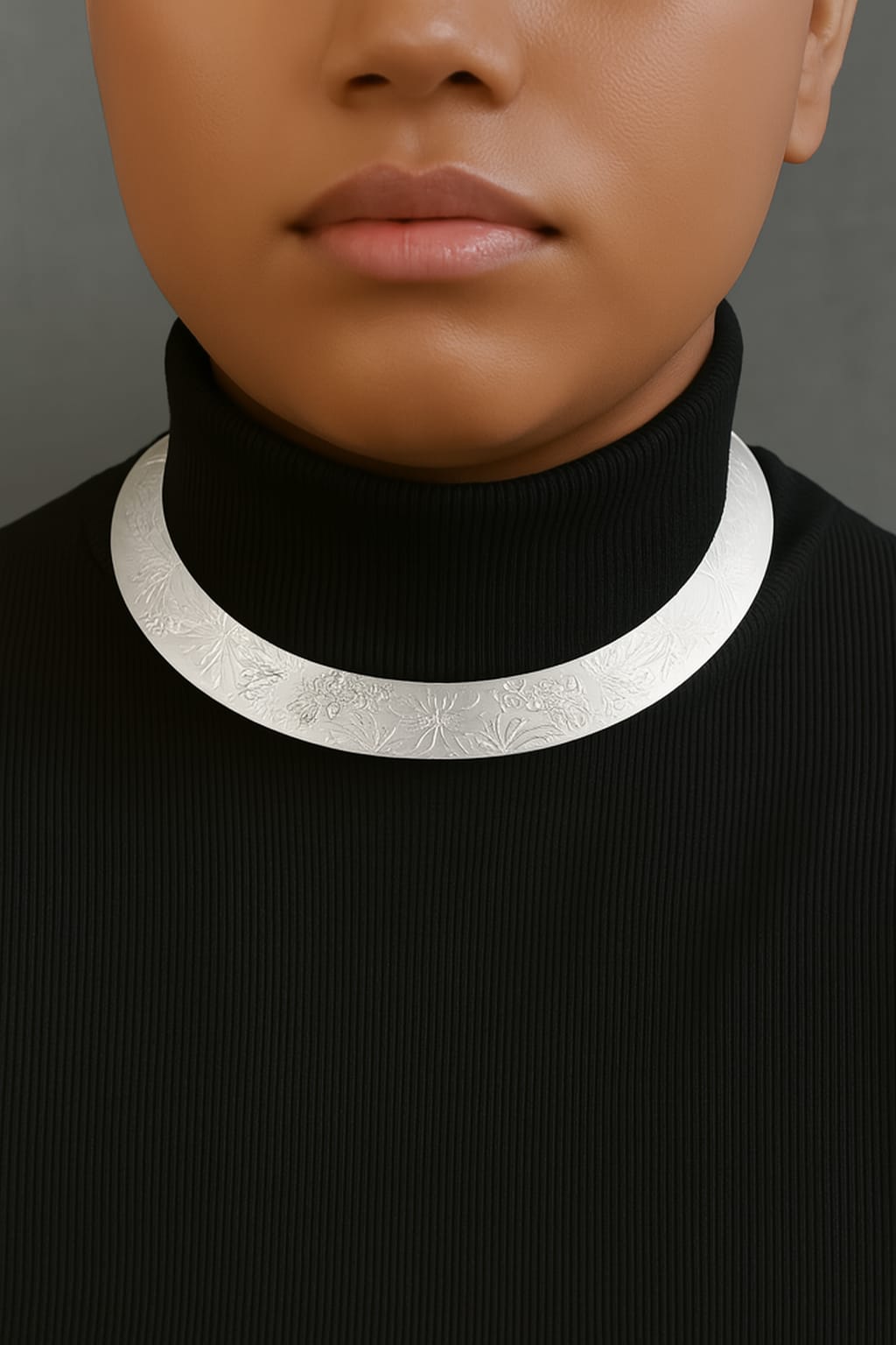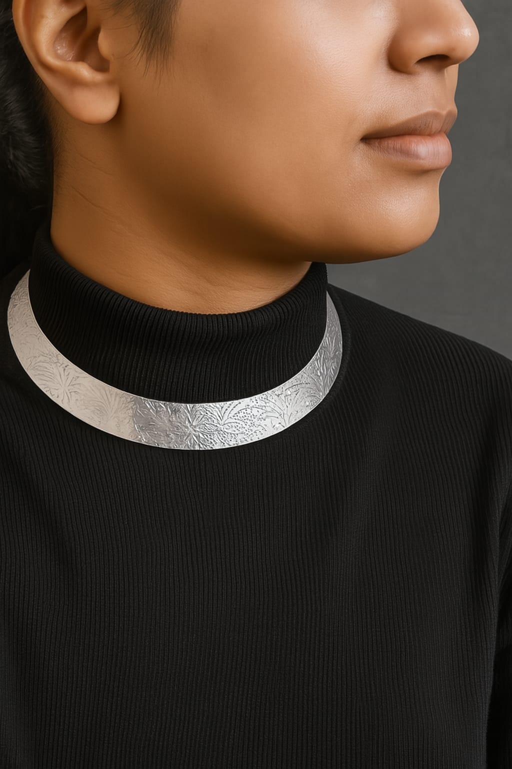 Embrace timeless elegance with this exquisite silver brass hasli, a classic collar necklace that beautifully frames the neckline. Crafted from premium brass with a lustrous silver finish, this piece features delicate floral engravings that wrap around the entire surface, showcasing traditional artisan craftsmanship at its finest.