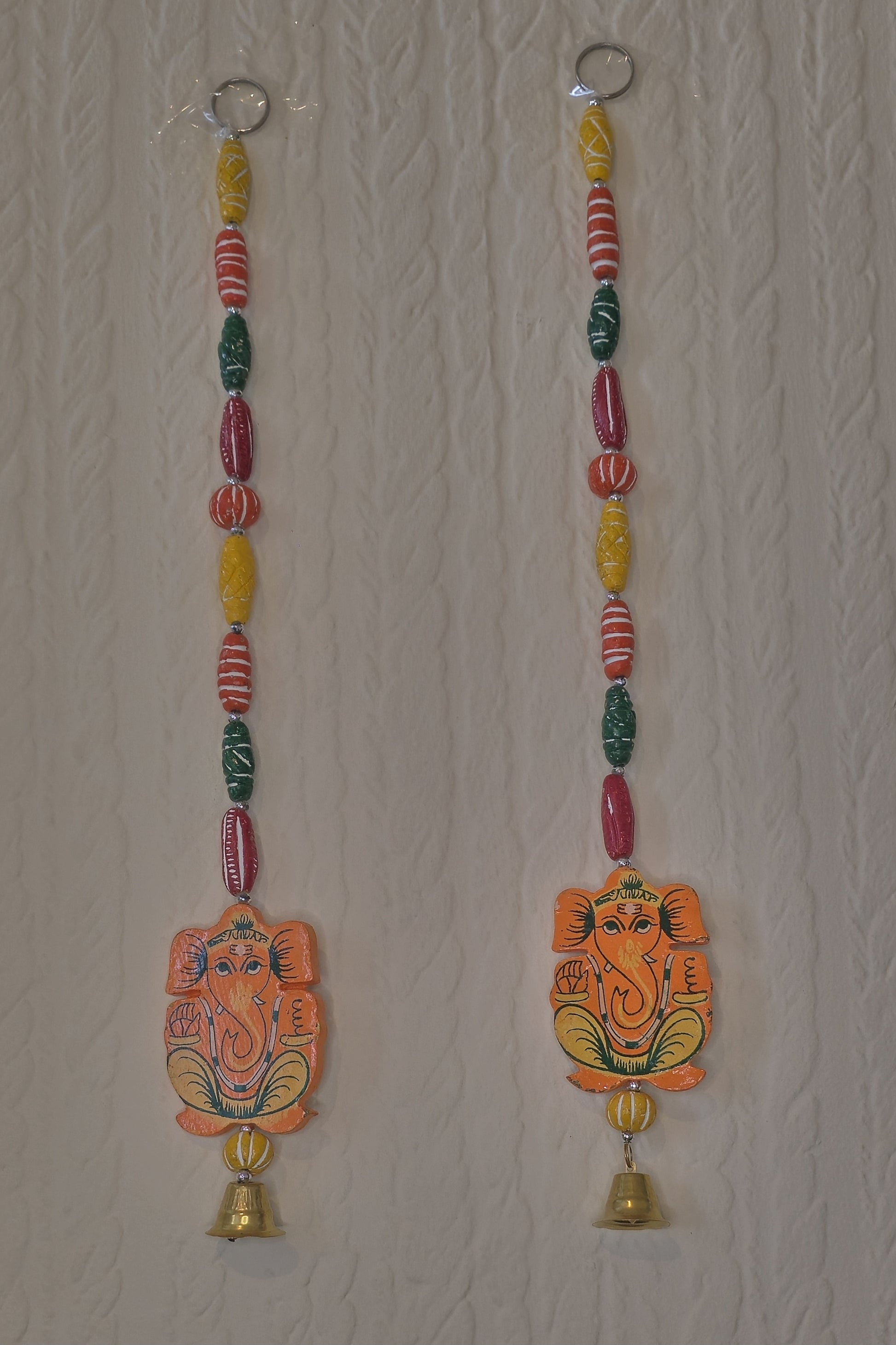 This wooden Ganesha wall hanging is a beautifully crafted decorative piece, combining traditional artistry with vibrant colors. It features two wooden cutouts of Lord Ganesha, each intricately painted in bright orange, with detailed black and gold accents highlighting the deity's serene face and intricate designs on the body. The wooden Ganesha figures are positioned at the bottom of the hanging, attached to a series of colorful wooden beads in shades of red, green, yellow, and white, which form a chain-like structure.